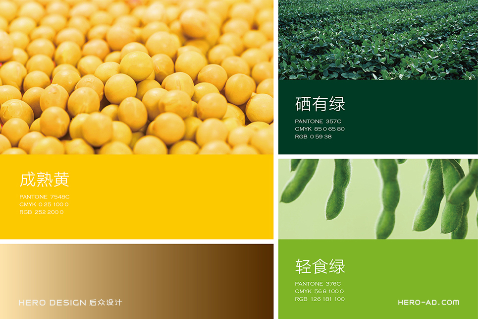 同時(shí),為調(diào)和視覺(jué)感受,有助于后期色彩應(yīng)用,通過(guò)對(duì)大豆不同生長(zhǎng)時(shí)期的色彩進(jìn)行提純優(yōu)化,同步確定了輔助色:硒有綠與輕食綠。