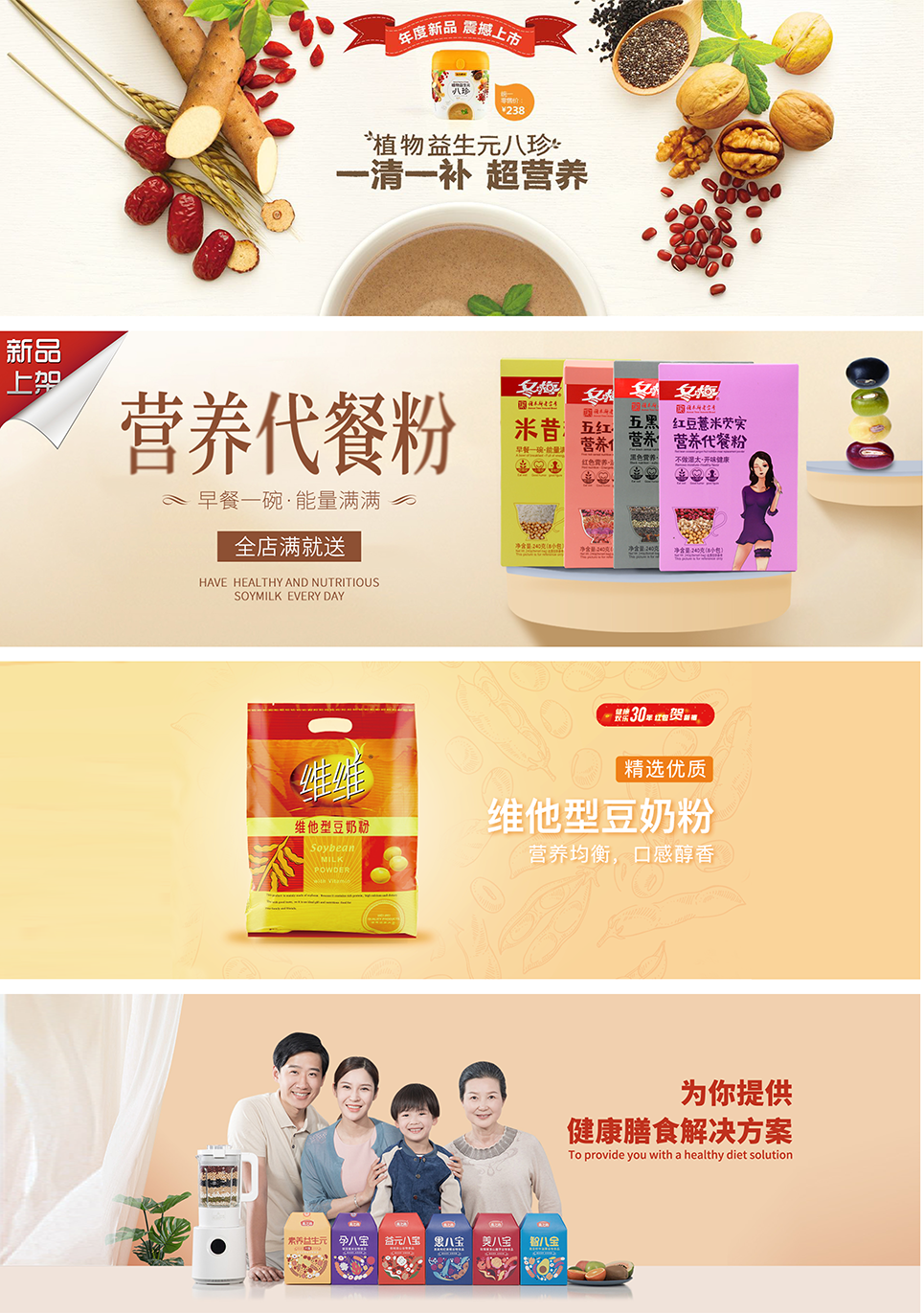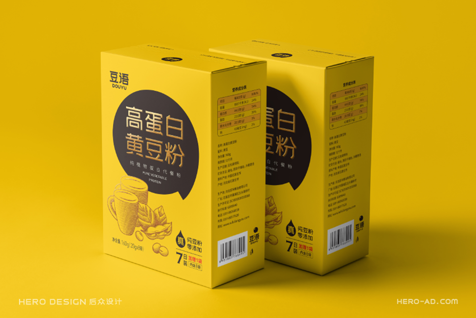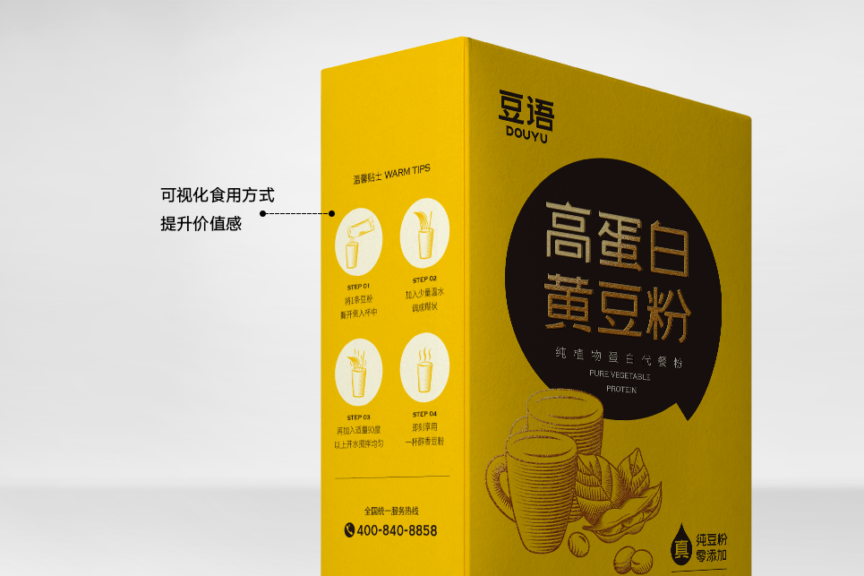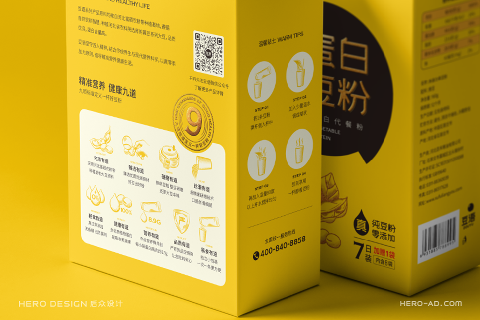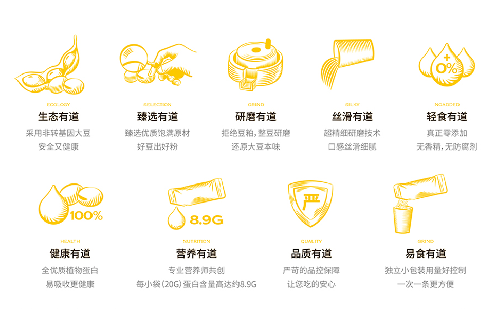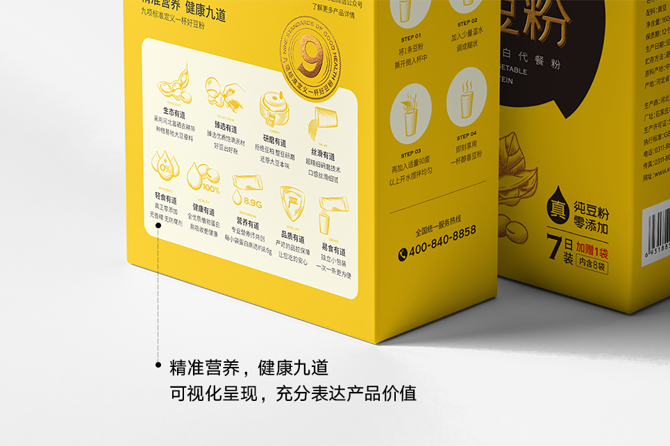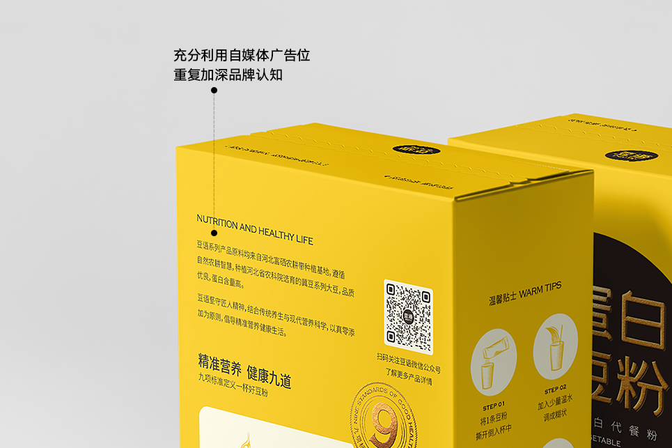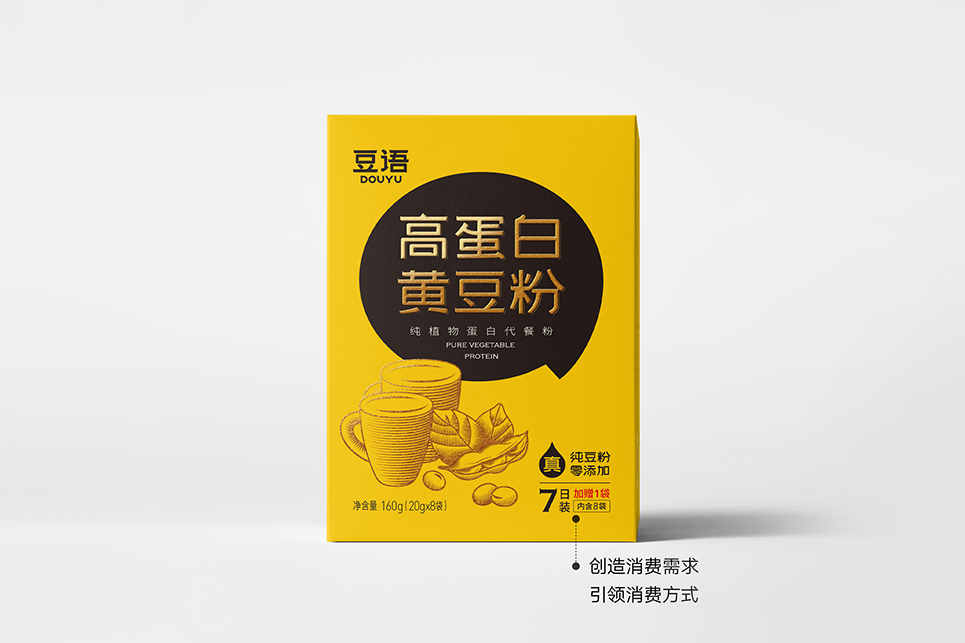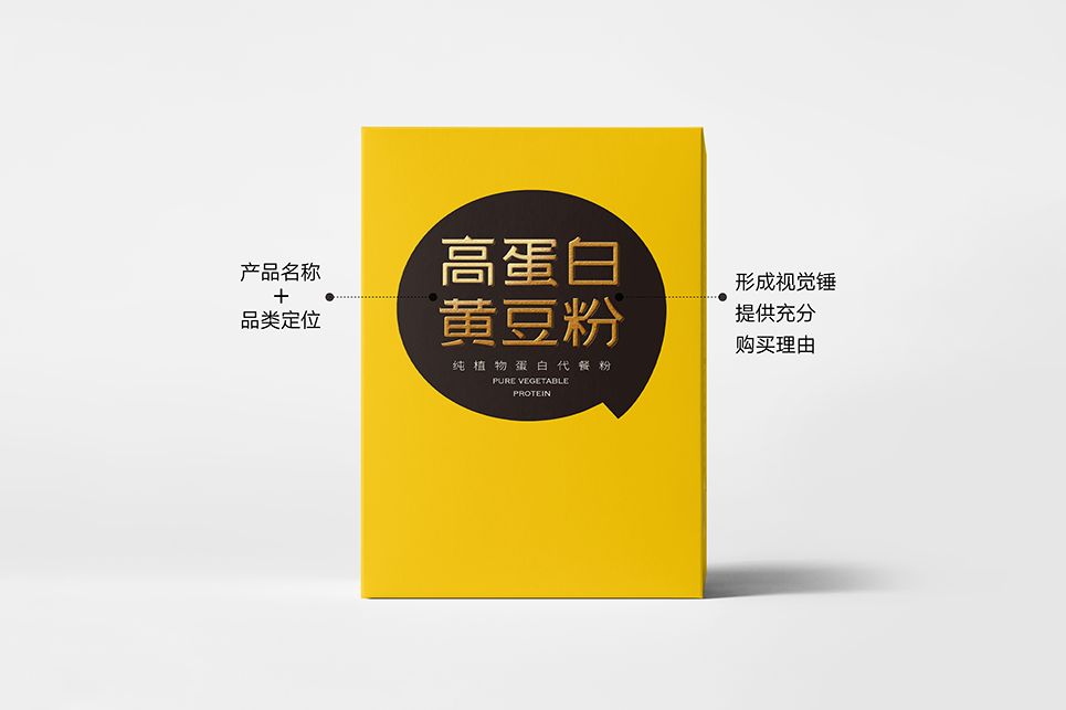 只豐富產(chǎn)品名稱(chēng)還不夠,為了補(bǔ)充產(chǎn)品在營(yíng)養(yǎng)方面的傳播,我們給到產(chǎn)品一個(gè)定位語(yǔ):純植物蛋白代餐粉。將產(chǎn)品定位語(yǔ)與產(chǎn)品名稱(chēng)組合出現(xiàn)在包裝上,再一次給到消費(fèi)者一個(gè)購(gòu)買(mǎi)理由,我們可以試想一下消費(fèi)者購(gòu)買(mǎi)產(chǎn)品時(shí)的心理活動(dòng),當(dāng)消費(fèi)者看到這個(gè)名稱(chēng)的時(shí)候會(huì)思考,什么情況下我要購(gòu)買(mǎi)它,透過(guò)名稱(chēng)我知道,當(dāng)我需要補(bǔ)充蛋白質(zhì)的情況下,我可以嘗試購(gòu)買(mǎi)它,透過(guò)產(chǎn)品定位“代餐粉”我知道,在我要以代餐代替正餐或正在減肥的情況下,我可以嘗試購(gòu)買(mǎi)它,當(dāng)產(chǎn)品有了全新的名稱(chēng)及品類(lèi)定位時(shí),就像給予了產(chǎn)品一個(gè)名正言順的身份,在傳統(tǒng)的豆粉品類(lèi)中開(kāi)辟出一條更加清晰的新賽道,以代餐粉的名義,為消費(fèi)者提供精準(zhǔn)的植物蛋白營(yíng)養(yǎng)食品,打造以大豆為原料的全植物蛋白健康生活新樣本。