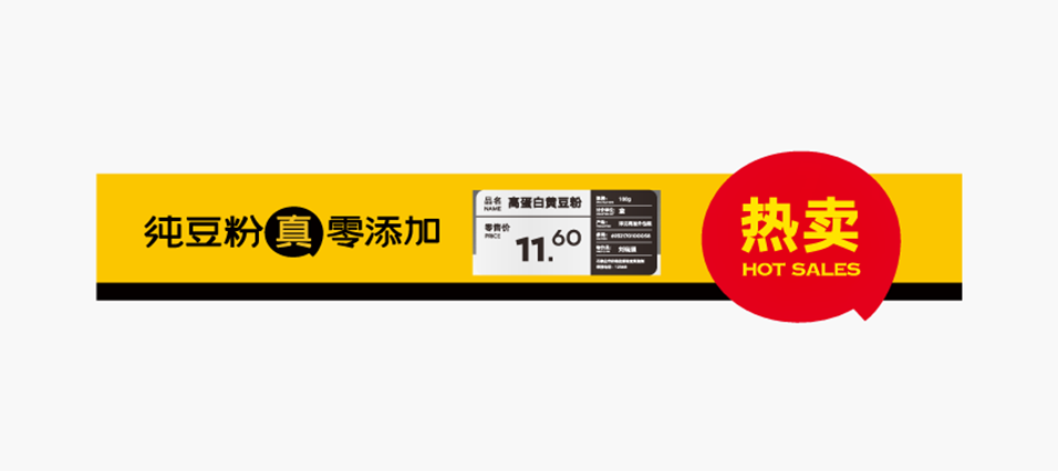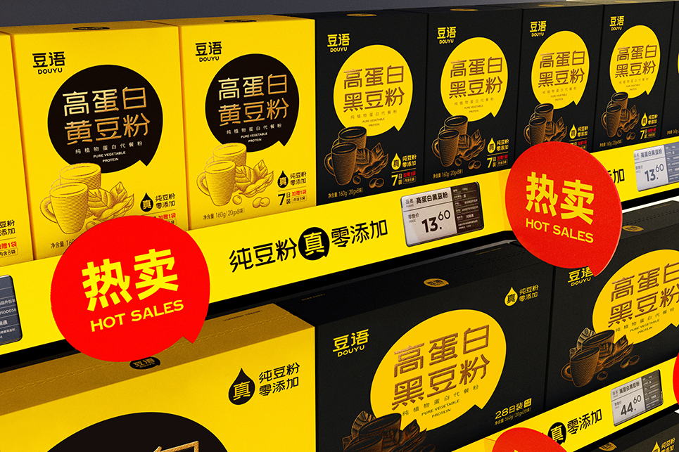在設(shè)計(jì)豆語(yǔ)的貨架物料時(shí),我們將貨架貼、貨架插卡、熱賣(mài)牌進(jìn)行三合一處理,以豆語(yǔ)的超級(jí)符號(hào)對(duì)話框的形態(tài),紅底黃字特別搶眼醒目,在營(yíng)造濃烈熱賣(mài)氛圍同時(shí),完成對(duì)豆語(yǔ)品牌形象的全方位滲透與展示。既能快速抓住消費(fèi)者眼球,又強(qiáng)化了豆語(yǔ)的品牌視覺(jué)資產(chǎn)。
