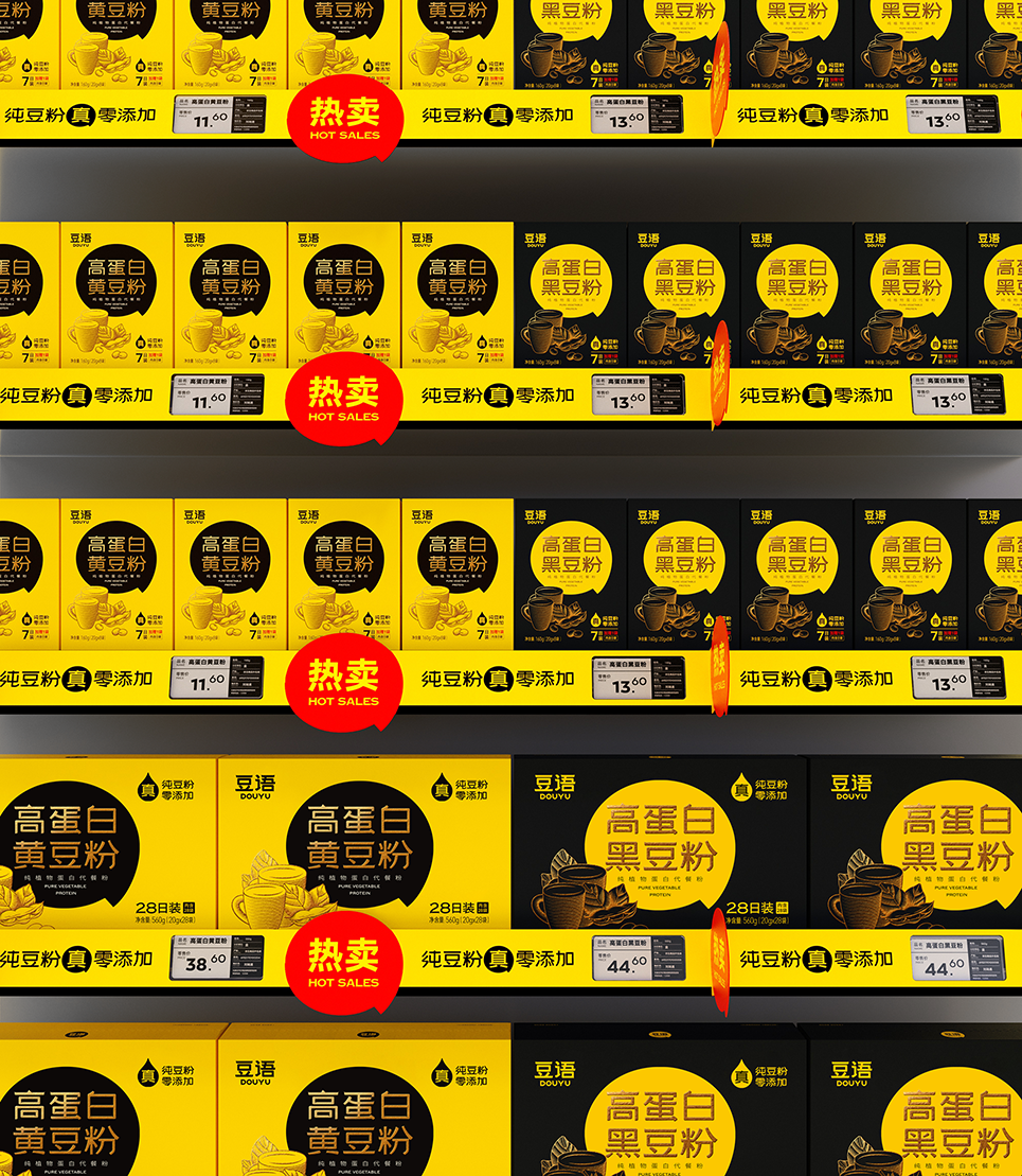 為了增加對(duì)不同角度過(guò)往消費(fèi)者目光的吸引,我們?cè)谄矫娌蹇ǖ幕A(chǔ)上,增加了折角插卡,讓人從側(cè)面角度也能看到火紅的對(duì)話框上寫(xiě)著熱賣(mài)二字,完成對(duì)隨機(jī)消費(fèi)人群的視覺(jué)和心理激勵(lì),而當(dāng)消費(fèi)者走近貨架,大排面的插卡貼與豆語(yǔ)小黃盒融為一體,形成更直觀的吸引。