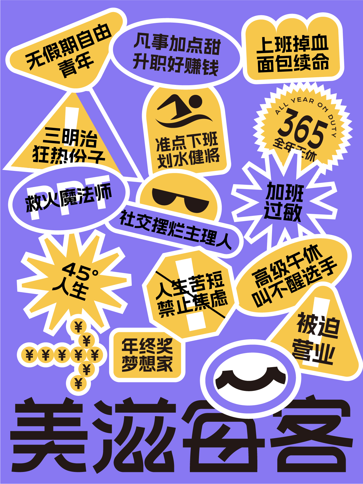 受客戶委托,后眾為其進(jìn)行整體品牌策略形象升級,以“Office”的主題概念打開年輕人的消費(fèi)市場,品牌標(biāo)志以“M”字母入手,將其創(chuàng)作成為一個(gè)代表“微笑”的獨(dú)特符號,在門店消費(fèi)環(huán)境中,融入了“打工”、“內(nèi)卷”等當(dāng)下年輕人較為熱議的話題,利用詼諧自嘲的表現(xiàn)形式,有溫度有新意的去消解人們?nèi)粘9ぷ骼锏姆ξ逗途衿v。幫助品牌形成話題傳播,從而快速提升美滋每客品牌市場認(rèn)知、擴(kuò)大品牌影響力。