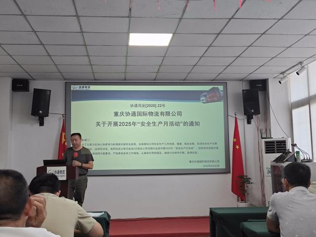 接下來唐云忠傳達了渝北道運〔2025〕21號重慶市渝北區道路運輸事務中心關于印發2025年“安全生產月”活動方案的通知,和協通司發[2025] 22號重慶協通國際物流有限公司關于開展2025年“安全生產月活動”的通知。