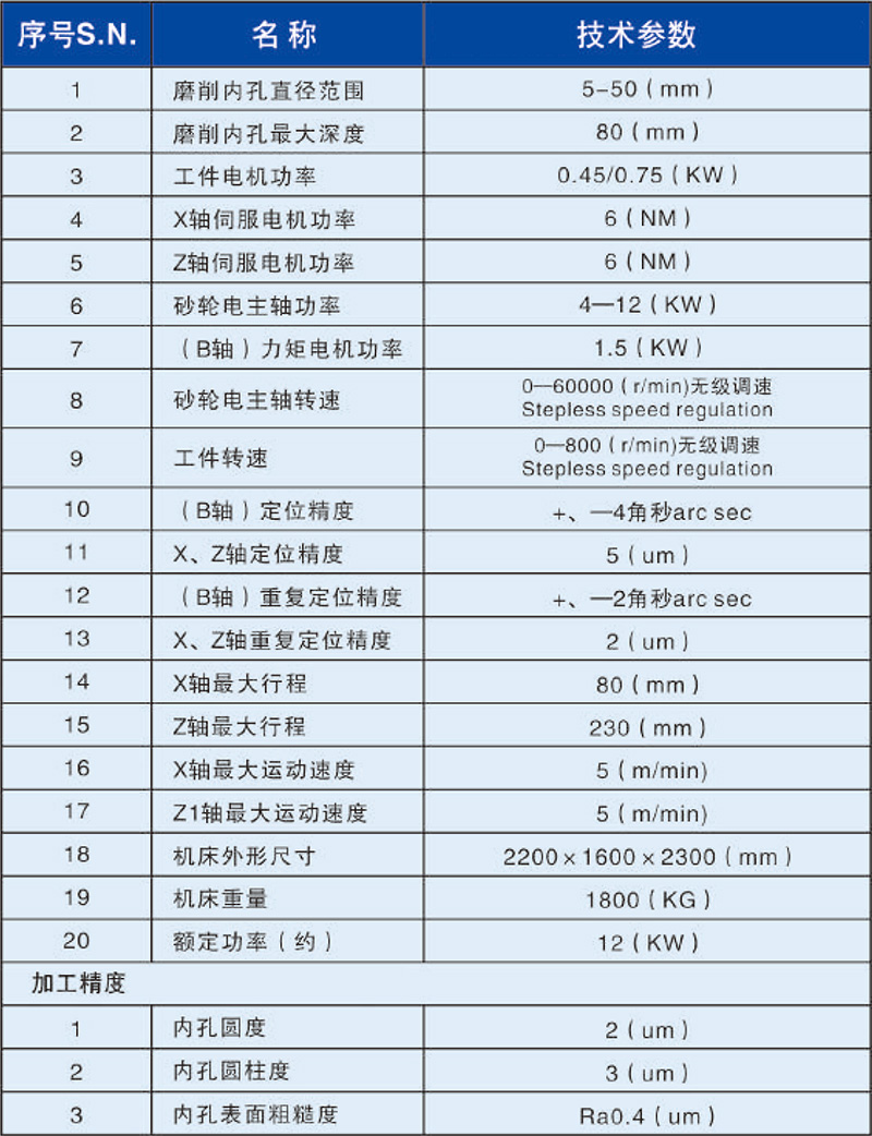 ●本機(jī)床為三軸(X進(jìn)給、Z砂輪、B分度軸)數(shù)控內(nèi)圓磨床,主要用于磨削工件的內(nèi)圓孔、內(nèi)錐孔、內(nèi)端面、外端面的磨削。磨削循環(huán)均自動(dòng)完成(具有自動(dòng)進(jìn)刀、退刀、粗磨、精磨;自動(dòng)修正砂輪、自動(dòng)補(bǔ)償?shù)裙δ埽?br /> ●機(jī)床采用工件進(jìn)給,B軸分度(力矩轉(zhuǎn)臺(tái)),工作臺(tái)(砂輪架)左右運(yùn)動(dòng)的結(jié)構(gòu)方式,工件箱進(jìn)給及砂輪架運(yùn)動(dòng)導(dǎo)軌均為滾動(dòng)直線導(dǎo)軌,均由伺服電機(jī)驅(qū)動(dòng)滾珠絲杠運(yùn)動(dòng),工件主軸及砂輪主軸旋轉(zhuǎn)速度均由變頻器控制,實(shí)現(xiàn)無級(jí)調(diào)速。工件夾緊為液壓動(dòng)力卡盤,同時(shí)可以根據(jù)用戶工件的特殊性配置其它相匹配的夾具●機(jī)床為全封閉防護(hù)罩殼,前置回轉(zhuǎn)式操作箱、后置背包式電器柜。